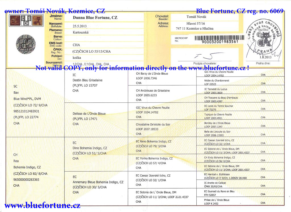 Rodokmen kočky CH Dunna Blue Fortune, CZ"