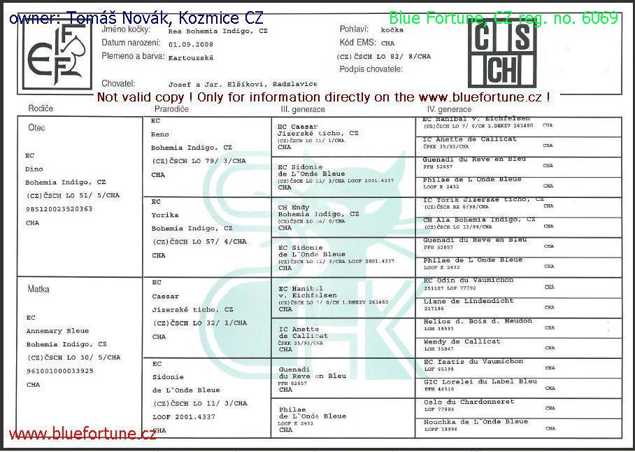 Rodokmen kočky CH Rea Bohemia Indigo, CZ"