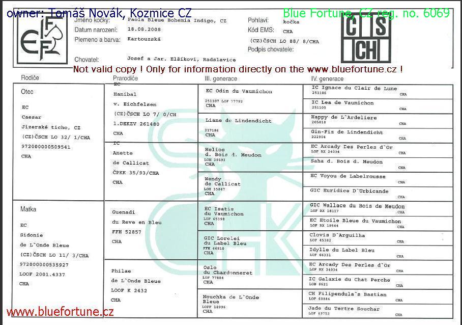 Rodokmen kočky CH Paola Bleue Bohemia Indigo, CZ"